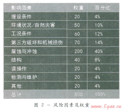 盡管危險辨識不能為風(fēng)險決策直接提供信息,但仍然是風(fēng)險分析的關(guān)鍵步驟。有時危險辨識分析能采用結(jié)構(gòu)技巧進(jìn)行分析,有時危險辨識則不是系統(tǒng)地進(jìn)行分析,而著重分析一些可能發(fā)生的危險。對于運行期管道,主要對影響管道壽命和管道運行安全的風(fēng)險進(jìn)行分析。