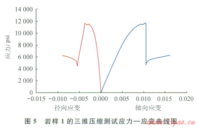 三維壓縮實驗應(yīng)力 應(yīng)變曲線如圖5、6所示。巖石材料的塑性與脆性可根據(jù)應(yīng)力、應(yīng)變曲線上負(fù)坡的坡降大小來劃分。負(fù)坡較陡者為脆性,反之為塑性。由圖5、6可知:巖樣1和巖樣2在應(yīng)力分別為l2000psi(1psi=6.895kPa)和20000psi時,應(yīng)變?yōu)?span lang="EN-US">0.01、0.009時破碎,屬于脆性巖石,且?guī)r樣2應(yīng)力、應(yīng)變曲線上的負(fù)坡較陡,故其脆性優(yōu)于巖樣1。