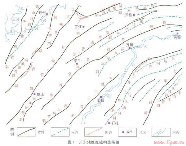 四川盆地東部地區(qū)(以下簡(jiǎn)稱(chēng)川東地區(qū))構(gòu)造位置隸屬于川東高陡構(gòu)造帶[1],發(fā)育一系列北東西南向延伸和隔擋式分布的大型復(fù)背斜和復(fù)向斜(圖1)。背斜核部主要出露下三疊統(tǒng)嘉陵江組,背斜兩翼至向斜核部依次出露中三疊統(tǒng)雷口坡組,上三疊統(tǒng)須家河組,下侏羅統(tǒng)自流井組,中侏羅統(tǒng)新田溝組、沙溪廟組及上侏羅統(tǒng)遂寧組和蓬萊鎮(zhèn)組等地層。順背斜核部走向,發(fā)育有多條疊瓦狀分布的逆斷層,斷面傾北西,被斷層切割的斷背斜南東翼陡,北西翼緩。川東地區(qū)是四川盆地最重要的滅然氣產(chǎn)地之一,從石炭系黃龍組至三疊系須家河組,于海相的碳酸鹽巖和陸相的碎屑巖地層中,發(fā)育有多套含氣層系和眾多大、中型氣陽(yáng),已開(kāi)發(fā)氣田多位于高陡背斜構(gòu)造帶[1-5],而近期在梁甲與萬(wàn)州交界處的拔山寺向斜南段,于下侏羅統(tǒng)自流井組大安寨段湖相黑色頁(yè)巖夾薄層介殼灰?guī)r組合中,有多口鉆井鉆獲中、高產(chǎn)油氣流,是繼川中和川北地區(qū)之后,在川東地區(qū)大安寨段非常規(guī)油氣藏勘探取得的重大進(jìn)展,不僅顯示了川東地區(qū)大安寨段具備良好的貞巖氣(油)成藏條件和勘探潛力[6-10],同時(shí)開(kāi)拓了該地區(qū)高陡構(gòu)造帶向斜構(gòu)造部位非常規(guī)油氣藏勘探的新領(lǐng)域。