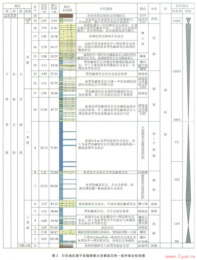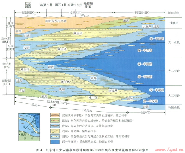 1)川東地區(qū)大安寨段為淡水湖泊沉積體系,發(fā)育濱湖、淺湖、湖坡和深—半深湖4種亞相,對(duì)應(yīng)完整的湖侵湖退旋回過(guò)程,可劃分為低位、湖侵、早期高位和晚期高位4個(gè)沉積體系域。