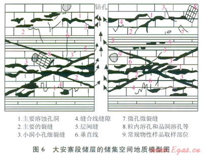 圖6為綜合上述各項(xiàng)儲(chǔ)集空間特征的儲(chǔ)層地質(zhì)模型[19],從中不難確定,對(duì)大安寨段儲(chǔ)層貢獻(xiàn)最大的無(wú)疑是各類(lèi)裂縫及沿裂縫溶蝕形成的各類(lèi)溶縫、溶孔和溶洞,其次為晶間孔,溶蝕微孔和微縫雖然很小,但數(shù)量眾多,其貢獻(xiàn)也不容忽視。