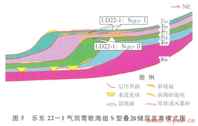 樂東22-1氣田主物源來自北東方向的海南島,為發(fā)育在陸架濱 淺海背景下,受沉積坡折控制的灘壩復(fù)合體沉積。儲(chǔ)層的形成,與海平面短期快速升降、強(qiáng)制性海退背景下形成的4級(jí)層序有關(guān)。4級(jí)層序界面以類工型界面為主,層序結(jié)構(gòu)主要表現(xiàn)為前積型特征,頂積層較薄(圖4)。S型疊加4級(jí)層序的頂積層可形成良好的儲(chǔ)集層,在沉積坡折以下多以淺海相泥巖、泥質(zhì)粉砂巖為主,儲(chǔ)層不發(fā)育(圖5)。準(zhǔn)確把握層序形成機(jī)制和疊加樣式[7-8],可以有效地預(yù)測和把握有利儲(chǔ)層的分布,減少儲(chǔ)層預(yù)測上的失誤,降低風(fēng)險(xiǎn)。通過對(duì)儲(chǔ)層的精細(xì)描述,刻畫有利砂體的展布,指導(dǎo)生產(chǎn)井的部署和井位優(yōu)化。