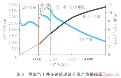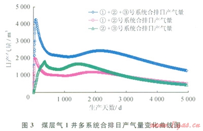 ①號系統(tǒng)和②號系統(tǒng)合排,最高產(chǎn)氣量約為2000m3/d,平均產(chǎn)氣量為950m3/d左右,1000m3/d產(chǎn)量可持續(xù)2800d左右(圖3),15a累計產(chǎn)量為4.68×106m3;②號系統(tǒng)和③號系統(tǒng)合排,最高產(chǎn)氣量也在2000m3/d左右,平均產(chǎn)氣量為1100m3/d左右,1500m3/d日產(chǎn)量持續(xù)2000d左右,15a累計產(chǎn)量為5.39×106m3;①、②、③這3個系統(tǒng)合排,最高產(chǎn)氣量達到4300m3/d,平均產(chǎn)氣量為2100m3/d左右,2000m3/d產(chǎn)量可持續(xù)3300d左右,l5a累計產(chǎn)量為10.45×106m3。實際排采時由于各系統(tǒng)壓力不同,系統(tǒng)間相互干擾,并非所有含氣系統(tǒng)都有產(chǎn)能貢獻。