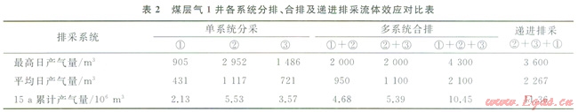 單獨排采①號系統(tǒng),產(chǎn)氣量介于306~905m3/d,平均為431m3/d(圖2),15a排采的累計產(chǎn)氣量為2.13×106m3(表2);單獨排采②號系統(tǒng),產(chǎn)氣量介于502~2952m3/d,平均為lll7m3/d,15a排采的累計產(chǎn)氣量為5.53×106m3;單獨排采③號系統(tǒng),產(chǎn)氣量介于413~l486m3/d,平均為721m3/d。15a排采的累計產(chǎn)氣量為3.57×106m3。