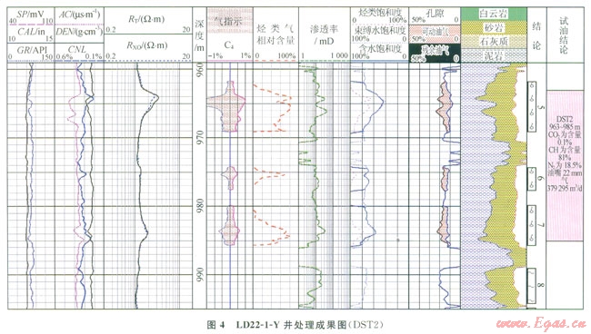 圖4顯示LD22-1-Y井963~985m段測(cè)井定量計(jì)算烴類氣含量為75%左右,測(cè)試證實(shí)該層甲烷含量為81%。通過(guò)鶯歌海盆地l5口井19個(gè)層位測(cè)井計(jì)算烴類氣含量與實(shí)測(cè)結(jié)果對(duì)比,在統(tǒng)計(jì)的l9層中,絕對(duì)誤差在20%以內(nèi)的層有l5層,占79%;絕對(duì)誤差在10%以內(nèi)的層有l2層,占63%[13]。表明該定量方法能較為有效地計(jì)算烴類氣含量,從而達(dá)到區(qū)分烴類氣與非烴氣的目的。