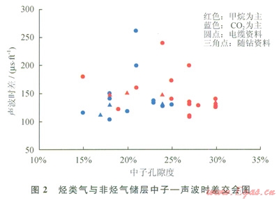 通過(guò)分析圖1、2可以發(fā)現(xiàn),中子測(cè)井與密度測(cè)井能較好地區(qū)分以甲烷為主的烴類氣層與二氧化碳?xì)鈱樱宦暡y(cè)井對(duì)兩類氣體的區(qū)別能力相對(duì)較差。隨鉆測(cè)井資料由于是地層剛鉆開(kāi)時(shí)獲得的資料,對(duì)兩者的區(qū)分效果要比電纜測(cè)井資料好[11]。