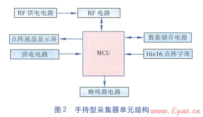 手持型采集器中MCU、供電電路、RF供電電路、RF電路、數(shù)據(jù)儲(chǔ)存電路的功能與無線遠(yuǎn)傳燃?xì)獗碇懈鲉卧墓δ芤恢?。其他單元的功能為:點(diǎn)陣液晶顯示屏:負(fù)責(zé)顯示手持型采集器的工作信息及計(jì)量數(shù)據(jù);16×16點(diǎn)陣字庫:作為點(diǎn)陣液晶顯示屏的字庫;蜂嗚器電路:為手持型采集器蜂鳴器提供電力,保證蜂嗚器正常工作。
