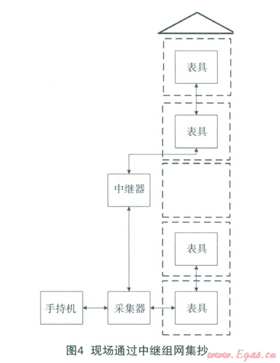 對于進入樓道較為困難的樓棟,適用的抄表方式有:②現(xiàn)場中繼直抄方式,③現(xiàn)場組網(wǎng)集抄方式,④在線集中器組網(wǎng)方式。