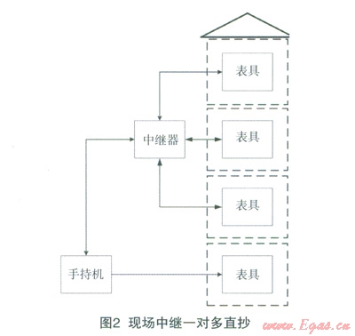 移動手抄器通過中繼可與表具之間組成一對多點的直抄網(wǎng)絡。移動手抄器發(fā)出指令,中繼接收指令后開始直抄,一次喚醒,以此發(fā)送命令,各表具按命令回應數(shù)據(jù),最后中繼將數(shù)據(jù)返同給移動手抄器。