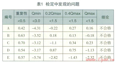 一批準(zhǔn)確度等級(jí)為l.5級(jí)的腰輪流量計(jì)經(jīng)維修組裝完成后,沒有通過模擬運(yùn)行工作臺(tái)跑活,送往檢測(cè)中心進(jìn)行檢定,檢定結(jié)果顯示,其中5臺(tái)表具的重復(fù)性和點(diǎn)誤差數(shù)據(jù)不合格(表1)。