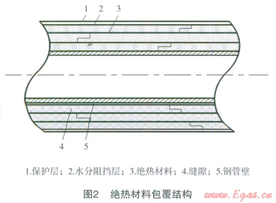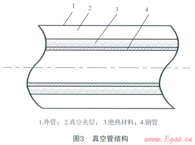 LNG槽車到站后,通常通過低溫泵法或增壓器法對槽車內(nèi)LNG增壓后將LNG卸入儲(chǔ)罐內(nèi)。不論采用哪種方法,LNG必須通過低溫管道進(jìn)行輸送,在輸送過程中,LNG將吸收外界環(huán)境熱量而氣化,產(chǎn)生BOG。為了減少BOG的產(chǎn)生,通常利用兩種方法對低溫管道進(jìn)行保冷處理,即絕熱材料包覆法和真空管法,這兩種方法結(jié)構(gòu)如圖2、3所示[5]。
