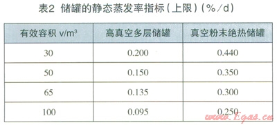 (2)設(shè)計(jì)文件應(yīng)對LNG儲(chǔ)罐提出明確的保冷指標(biāo)要求。不論是真空粉末絕熱儲(chǔ)罐還是高真空多層絕熱儲(chǔ)罐對保冷都應(yīng)有明確的要求,即某體積的儲(chǔ)罐都應(yīng)對應(yīng)相應(yīng)的真空度和靜態(tài)蒸發(fā)率,超過這些數(shù)值指標(biāo)就達(dá)不到保冷效果,蒸發(fā)氣體產(chǎn)生量就會(huì)增加,應(yīng)及時(shí)抽真空處理或采取其他措施。綜合相關(guān)規(guī)范和工程實(shí)踐,提出儲(chǔ)罐的保冷指標(biāo)要求,儲(chǔ)罐的封結(jié)真空度指標(biāo)要求見表1,靜態(tài)蒸發(fā)率指標(biāo)(上限)要求見表2。