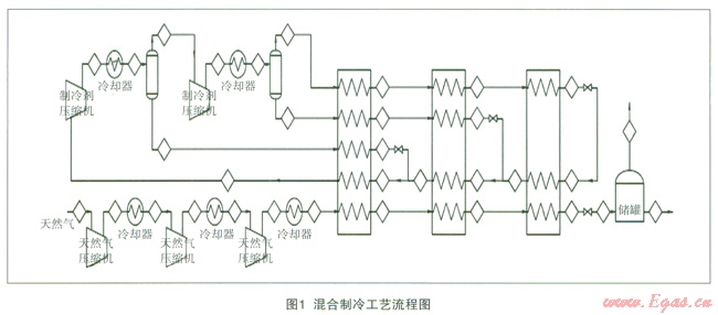 流程簡(jiǎn)述:天然氣原料通過壓縮機(jī)一級(jí)壓縮并和循環(huán)水換熱,然后通過二級(jí)壓縮二次和循環(huán)水換熱,再經(jīng)過三級(jí)壓縮換熱進(jìn)入換熱器(LNGl00)和制冷劑一次換熱,再經(jīng)換熱器(LNGl01)二次換熱,最后進(jìn)入換熱器(LNGl02)換熱流入LNG大罐。另一路為制冷劑閉路循環(huán)從板翅式換熱器LNGl00復(fù)熱回來的制冷混合劑經(jīng)離心壓縮機(jī)一級(jí)壓縮換熱,流出分兩路,液體進(jìn)入板翅式換熱器進(jìn)行節(jié)流換熱。一路混合氣體再次經(jīng)二級(jí)壓縮換熱,分兩路氣體和液體氣體一路進(jìn)入板翅式換熱器,二級(jí)壓縮分離出來的液體經(jīng)板翅式換熱器(LNGl00、LNGl00、LNGl00)換熱匯總到離心壓縮機(jī)進(jìn)口。