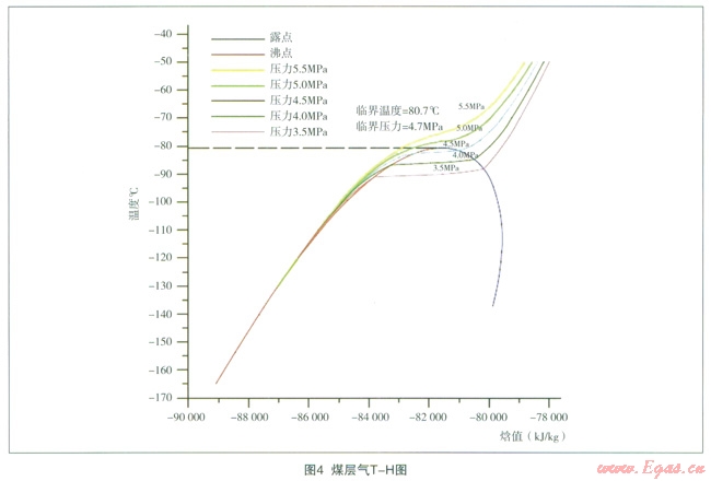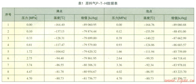 在特定壓力下,利用根據(jù)圖l建立的系統(tǒng)模型對(duì)煤層氣從初溫-40℃冷卻至-l40℃的過程中對(duì)煤層氣的T-H進(jìn)行模擬計(jì)算,結(jié)果詳見表2。