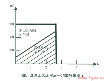 改進(jìn)工藝流程平均加氣量圖示:上部為管束氣瓶直接加入CNG汽車天然氣氣量,下部為經(jīng)壓縮機(jī)壓縮的加氣量;改進(jìn)工藝流程后加氣量由1000m3/h增加到1500m3/h;一輛管束車卸氣時間由原4h/車縮短到3h/車以內(nèi);改進(jìn)工藝流程后相對減少了壓縮機(jī)開機(jī)時間,減少了壓縮機(jī)的磨損并降低了能耗,實現(xiàn)了壓縮機(jī)在原有排氣量不變情況下提高加氣量的目的。