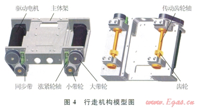 行走機(jī)構(gòu)主要由行走驅(qū)動電機(jī)、大帶輪、小帶輪、同步帶、漲緊輪軸、主體架、傳動齒輪軸、齒輪等組成(圖4)。