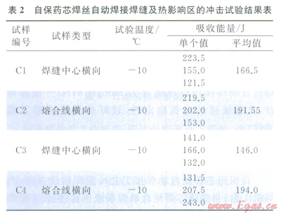 試驗證明,白保藥芯焊絲自動焊接過程平穩(wěn),焊縫成形好,焊接接頭的抗拉強(qiáng)度、側(cè)彎性能、硬度值、沖擊功等力學(xué)性能均滿足X80管線鋼的焊接標(biāo)準(zhǔn)要求。其焊縫及熱影響區(qū)的沖擊試驗結(jié)果見表2。同時,自保藥芯焊絲自動焊接可進(jìn)一步降低焊工的勞動強(qiáng)度,有效規(guī)避焊接施工中氣體供給帶來的不便,可降低管道焊接綜合成本。