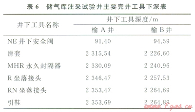 榆林南儲氣庫注采試驗井榆A和榆B采用井下懸掛壓力汁測壓完井管柱。榆A井采用Æ114.3mm油管,完井管柱全井段最小內(nèi)徑67.7mm(RN坐落短節(jié)處);榆B井采用Æl39.7mm油管,完井管柱全井段最小內(nèi)徑112.9mm(RN坐落短市處)。完井工具入井前測試合格,完井管柱下入施工順利,封隔器一次坐封、試壓及功能測試正常。完井后鋼絲作業(yè)和連續(xù)油管儲層改造管柱通過順暢。
