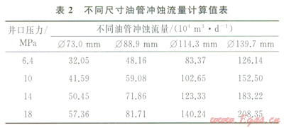 高速流動的氣體在金屬表面上運動,在氣體雜質(zhì)機械磨損與腐蝕介質(zhì)的共同作用下,會使油管腐蝕加速。實踐表明,氣體流速超過21.3m/s時,管柱沖蝕趨于嚴重。儲氣庫注采井運行過程中井口壓力為整個井筒壓力分布的最低點,沖蝕分析選擇井口為研究點。表2是不同油管在對應(yīng)井口壓力下的沖蝕流量[6-8]。