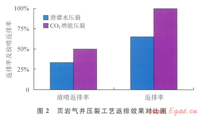 從圖2可以看出,采用CO2增能壓裂后,頁巖氣井的壓裂液放噴返排率提高了17%、最終返排率提高35%,同時(shí)排液周期從之前的平均45d縮短到25d左右,效果非常明顯。