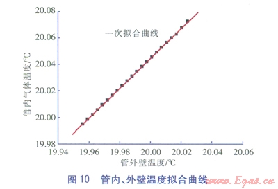 由圖9中傳熱進(jìn)行到60min后管道中心與管外壁的溫度曲線可以看出,當(dāng)傳熱達(dá)到穩(wěn)定時(shí),管內(nèi)溫度與管外壁溫度曲線接近重合,管內(nèi)溫度略高于管外壁溫度。取溫度場(chǎng)達(dá)到穩(wěn)定(1.5h)后的管內(nèi)、管外壁溫度數(shù)據(jù)進(jìn)行擬合,得到管內(nèi)和管外壁溫度的擬合曲線(見圖l0),其關(guān)系式見式(4)。圖l0中,黑點(diǎn)為模擬得到的管內(nèi)和管外壁溫度數(shù)據(jù)點(diǎn),紅線為一次擬合曲線。由圖10可以看出,埋地管道溫度場(chǎng)達(dá)到穩(wěn)定后,管內(nèi)溫度和管外壁溫度的溫差均小于0.1℃,與試驗(yàn)所獲得的數(shù)據(jù)基本符合(見表2)。