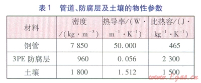 以規(guī)格為Æ219×6的20號(hào)鋼管為例進(jìn)行計(jì)算,采用3PE防腐,防腐層厚度為2mm,埋地深度h1為1m。管道、防腐層及土壤的物性參數(shù)經(jīng)現(xiàn)場(chǎng)測(cè)量,結(jié)果見表1。
