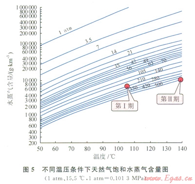 將2期充注成藏期的溫度、壓力投影至不同溫壓條件下天然氣飽和水蒸氣含量圖版上發(fā)現(xiàn)(圖5),在第Ⅰ充注期天然氣的攜水量介于5000~7000g/km3,在第Ⅱ充注期天然氣的攜水量介于l0000~12000g/km3,第Ⅱ期允注的天然氣攜水量是第Ⅰ期的近2倍,表明隨著溫度、壓力的增火火然氣攜水的能力鼴著增加,儲層中有更多的束縛水被蒸發(fā)氣化,不斷隨著天然氣的運移攜帶出儲層,增大了地層水被攜帶到上覆地層的可能性[14],有利于超低含水飽和度氣藏的形成。