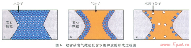 致密砂巖超低含水飽和度的形成過程如圖6所示,圖6-a為儲層早成巖期的機(jī)械壓實階段,此時干酪根未成熟,儲層孔喉中100%飽含地層水;圖6-b為儲層的可動水排出階段,此時隨著干酪根成熟度的增加,生成的天然氣注入儲集層,驅(qū)替儲層的可動水,儲層的含水飽和度接近于儲層的束縛水飽和度;圖6-c為束縛水蒸發(fā)氣化階段,此時隨著溫度壓力的增大和干氣的注入,使儲層的束縛水被蒸發(fā)氣化,不斷隨著天然氣的運移攜帶出儲層,從而形成超低含水飽和度氣藏。