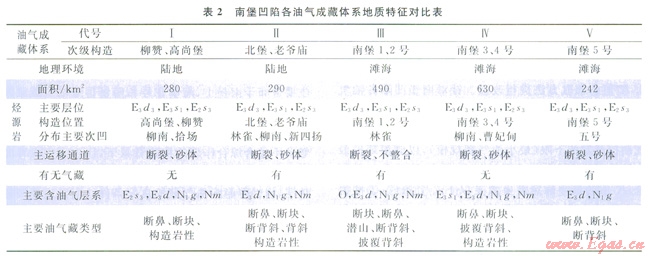 油氣成藏體系指地表以下油氣成藏的自然體系,包括形成油氣藏的一切要素,如烴源體、輸導(dǎo)體和圈閉以及這些元素之間有效的配置結(jié)果[6,11]。成藏體系以油氣聚集單位為中心,這是和含油氣系統(tǒng)以烴源巖為中心的本質(zhì)區(qū)別,因此,利用成藏體系能與勘探日標(biāo)更緊密結(jié)合。油氣成藏體系的劃分主要有以下原則:①劃分油氣成藏體系時(shí)烴源巖和主要油氣運(yùn)聚區(qū)兼顧;②1個(gè)具有統(tǒng)一油氣水界面的油氣藏只能屬于1個(gè)成藏體系;③對(duì)于多套烴源巖、多期成藏的多旋凹盆地,首先根據(jù)構(gòu)造層、高壓封閉層等劃分成藏旋同(生儲(chǔ)蓋含油氣組合),然后再在平面上劃分成臧體系[11]。油氣成藏體系的劃分主要應(yīng)用分割槽法或流體勢(shì)法[7,24],將運(yùn)載層頂面(蓋層底面)的流體勢(shì)場(chǎng)分成幾個(gè)油氣運(yùn)移方向和聚集區(qū),每1個(gè)運(yùn)移方向所包含的生油巖及其上方的圈閉組合就構(gòu)成了1個(gè)油氣成藏體系。利用該劃分方法,并結(jié)合該區(qū)油(氣)源對(duì)比分析的結(jié)果,南俸凹陷町劃分為5個(gè)油氣成藏體系(圖1)。各油氣成藏體系的地質(zhì)特征見(jiàn)表2。