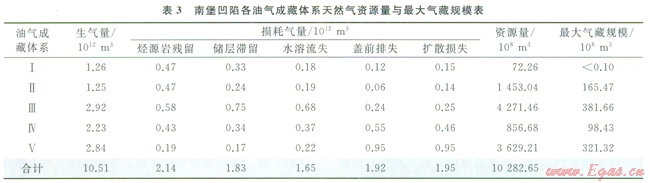 近年來(lái)在南堡凹陷占近系砂巖獲得了一些高產(chǎn)油氣流,天然氣的勘探值得重視,但對(duì)天然氣的資源最還認(rèn)識(shí)不清。因此筆者主要評(píng)價(jià)了符成藏體系的天然氣資源量。依據(jù)天然氣成藏過(guò)程中,不同損耗烴量的計(jì)算模型3[7,25-31],結(jié)合研究區(qū)的地質(zhì)條件,獲得了研究區(qū)的烴源巖殘留氣量、儲(chǔ)層滯留氣量、水溶流失氣量以及蓋前排失氣量,并由此計(jì)算了南堡凹陷各油氣成藏體系的天然氣資源囂(表3)。從天然氣資源量的對(duì)比情況看,南堡Ⅲ、Ⅴ號(hào)成藏體系的天然氣資源量最大,南堡Ⅱ號(hào)成藏體系的天然氣資源量次之,南堡Ⅰ、Ⅳ號(hào)成藏體系的天然氣資源懿相對(duì)較小,總天然氣資源量超過(guò)10000×108m3。本次估算的各成藏體系石油和天然氣的資源量與徐安娜[32]預(yù)測(cè)的南堡凹陷油氣分布情況基本一致。因此,南堡凹陷天然氣藏具有重要的勘探潛力。