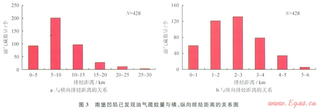 對(duì)428個(gè)構(gòu)造油氣藏排烴距離的統(tǒng)計(jì)表明(圖3-a),油氣藏主要分布在橫向排烴距離為0~15km范圍,其中5~l0km范圍內(nèi)最多,達(dá)201個(gè)。當(dāng)橫向排烴距離超過(guò)10km,油氣藏的個(gè)數(shù)隨排烴距離的增加旱減小的趨勢(shì)。這是由于在地質(zhì)條件下,隨烴源巖排烴距離的增加,烴源巖排出的烴類更容易遭受各種形式的殘留及損耗,導(dǎo)致運(yùn)移至儲(chǔ)層的烴類逐漸較少,由此削弱了烴源巖的供烴效率。另外,統(tǒng)計(jì)規(guī)律還表明,縱向排烴距離亦和油氣藏個(gè)數(shù)具有類似的規(guī)律(圖3-b),油氣藏主要集巾在小于4km的范圍。