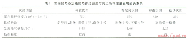 該區(qū)最大的次凹為林雀次凹,其累積排烴強(qiáng)度超過(guò)750×104t/km2,主要向其周邊的老爺廟構(gòu)造、北堡構(gòu)造、南堡1號(hào)構(gòu)造及南堡2號(hào)構(gòu)造供烴,而該4個(gè)構(gòu)造已發(fā)現(xiàn)的油氣儲(chǔ)量達(dá)到6.65×108t(表1)。而拾場(chǎng)次凹和柳南次凹向其周邊的高尚堡 柳贊構(gòu)造供烴,拾場(chǎng)次凹的累積排烴強(qiáng)度不超過(guò)250×l04t/km2,柳南次凹的累積排烴強(qiáng)度不超過(guò)350×104t/km2,高尚堡—柳贊構(gòu)造已發(fā)現(xiàn)的油氣儲(chǔ)量只有2.35×108t。由此可見(jiàn),高尚堡柳贊構(gòu)造盡管受到2個(gè)次級(jí)凹陷的供烴,但由于這2個(gè)次凹的排烴強(qiáng)度均較弱,最終導(dǎo)致該區(qū)聚集的油氣較其他構(gòu)造少。