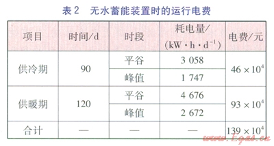 當(dāng)無水蓄能裝置時(shí),地源熱泵機(jī)組只在峰值和平谷時(shí)段運(yùn)行,每天運(yùn)行時(shí)間為11h。按式(1)、(2)計(jì)算無水蓄能裝置時(shí)的運(yùn)行電費(fèi),結(jié)果見表2。