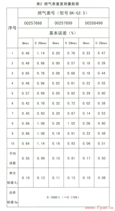 取三臺(tái)B級(jí)BK-G2.5型的皮膜式燃?xì)獗?,選擇Qmax(4.0m3/h)和0.2Qmax(0.8m3/h)兩個(gè)流量點(diǎn)連續(xù)測(cè)量10次得到6組測(cè)量數(shù)據(jù)(見(jiàn)表2),計(jì)算每組測(cè)量列的平均誤差di,然后按照貝賽爾公式可以算出每組測(cè)量列的單次實(shí)驗(yàn)標(biāo)準(zhǔn)差Sj,再推算出6組實(shí)驗(yàn)標(biāo)準(zhǔn)差的合并樣本標(biāo)準(zhǔn)差Sp,則有:u(v1)=Sp