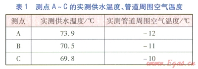 當(dāng)室外溫度比較接近時(shí),測(cè)點(diǎn)A~C的實(shí)測(cè)供水溫度、管道周?chē)諝鉁囟纫?jiàn)表l。