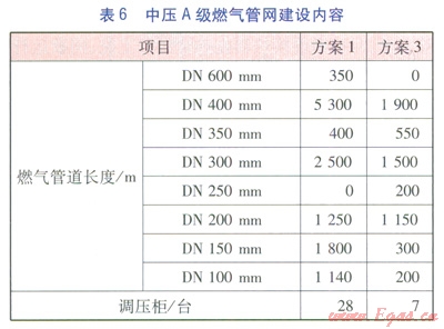 方案l~3各分項(xiàng)工程建設(shè)內(nèi)容分別見表2~6。表3中的熱網(wǎng)指一級管網(wǎng),由于二級管網(wǎng)(包括分散式低溫燃?xì)忮仩t房至熱用戶的管網(wǎng))造價(jià)由用戶分?jǐn)?,因此不?jì)入熱網(wǎng)造價(jià)中。由表2~6可計(jì)算得出方案l~3的工程造價(jià)分別為35237.74×104、43004.35×104、41047.11×104元。