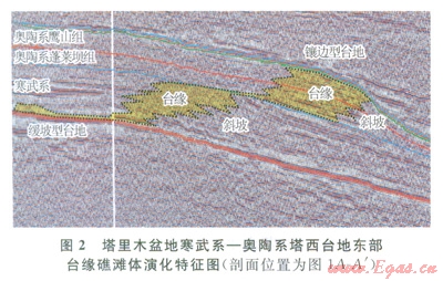 地震資料揭示了塔里木盆地塔西臺地寒武奧陶紀(jì)碳酸鹽巖臺地臺緣礁灘的演化過程(圖2)。塔西臺地東部在早寒武世早期表現(xiàn)為碳酸鹽緩坡[3],并在早寒武世中期(肖爾布拉克組沉積期)過渡為鑲邊臺地。早寒武世中期—晚寒武世,臺緣帶以加積—進(jìn)積的方式生長,厚度超過l500m,進(jìn)積距離在塔中—古城地區(qū)最大,可達(dá)80km。寒武紀(jì)末,海平面下降造成臺地暴露,結(jié)束了臺地生長過程,臺緣帶頂部見有明顯的削截現(xiàn)象。奧陶紀(jì),隨著海平面的再次上升,逐漸形成了第二個(gè)生命周期的碳酸鹽巖臺地建造。奧陶紀(jì)塔西臺地東緣主要以加積的方式生長,臺緣礁灘的厚度超過1200。