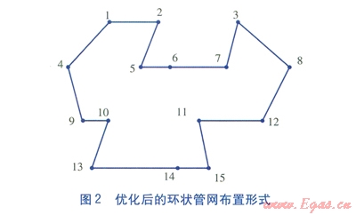 利用C語言編制蟻群算法程序,經(jīng)過多次試算確定蟻群算法的參數(shù)為:m=15,a=1.0,b=5.0,r=0.1,Q=100。迭代最大次數(shù)為200,防止出現(xiàn)死循環(huán)。優(yōu)化后的環(huán)狀管網(wǎng)布置形式見圖2,燃?xì)夤芫W(wǎng)總長度為15.143km。