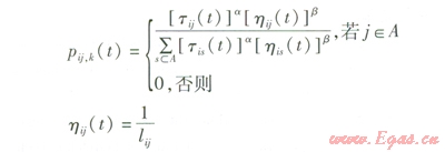 式中Pij(t)——t時刻螞蟻k由節(jié)點i轉(zhuǎn)移到節(jié)點j的狀態(tài)轉(zhuǎn)移概率