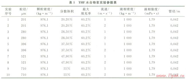 王武昌等[11]對四氫呋喃(THF)水合物在水平管道中的流動狀態(tài)進(jìn)行了大量實驗研究(表1),研究內(nèi)容包括顆粒粒徑、濃度以及流速等對水合物漿流動狀態(tài)的影響,筆者以其實驗數(shù)據(jù)為參照,對模型計算結(jié)果進(jìn)行了對比。