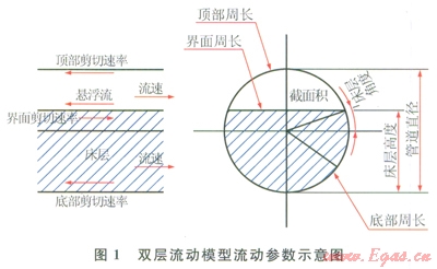 應(yīng)用以上模型,對于給定的系統(tǒng)參數(shù)(顆粒直徑、顆粒密度、顆粒平均濃度、連續(xù)相密度、連續(xù)相黏度、連續(xù)相平均流速以及管線直徑),結(jié)合式(1)~(6)求解即可得到兩相流動狀態(tài)及流動參數(shù)。雙層流動模型流動參數(shù)如圖l所示。