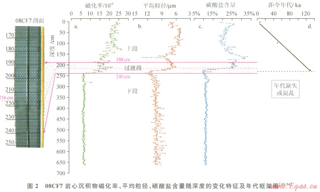 08CF7巖心在琴叁和取樣過程中未遭到人為破壞,且未見明顯生物擾動痕跡,因此能較好地指示其原位沉積特征。巖心觀察發(fā)現(xiàn),沉積物白頂向下以216cm處為界,上部為灰黑色,下部為淺黑色,交界面呈相互穿透狀,整段巖心的沉積物類型均為黏土質(zhì)粉砂。筆者在前期的研究中已對巖心沉積物進行粒度、磁化率和碳酸鹽含量測定和分析[34-35],將結果進行綜合對比和分析,發(fā)現(xiàn)這3項指標均呈現(xiàn)出相似的變化趨勢,可分為3段:①0~188cm段,各項指標變化較大,以磁化率值高,沉積物粒度小及碳酸鹽含量高為特征;②188~240cm段,為各項指標和沉積物巖性變化的過渡段;③240cm以下,各項指標呈現(xiàn)均一性變化,相對以磁化率值低,沉積物較粗及碳酸鹽含量低為特征(圖2)。