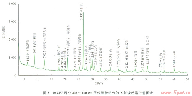 20個代表性樣品細粒組分的X射線衍射(XRD)結果見圖3和表l。細粒組分的礦物組成主要為伊利石、綠泥石(高嶺石)等黏土礦物,其占細粒組分總量的33.3%~55.5%,平均含量為43.9%,黏土礦物總含量變化不大,但巖心上部樣品的黏土總含量略高,中間部分樣品則較少。細粒組分中的其他礦物主要有石英、長石、黃鐵礦以及方解石、文石、白云石等碳酸鹽類礦物。
