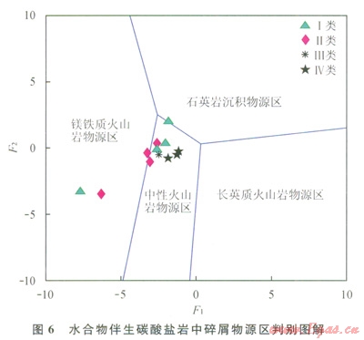 Roser和Korsch[28]曾提出通過(guò)沉積巖中Ti、Fe、Mg、Na、K氧化物含量對(duì)Al2O3含量比值作為判別函數(shù),來(lái)區(qū)分沉積巖碎屑物源區(qū)是鐵鎂質(zhì)、中性、長(zhǎng)英質(zhì)火山巖和石英巖4種沉積物源區(qū)(圖6)。判別函數(shù)F1=30.638TiO2/Al2O3-12.54Fe2O3/Al2O3+7.329MgO/Al2O3+12.031Na2O/Al2O3+35.402K2O/A12O3-6.382;判別函數(shù)F2=36.500TiO2/Al2O3-10.879Fe2O3/Al2O2+30.875MgO/Al2O3-5.404Na2O/Al2O3+11.112K2O/Al2O3-3.89[29-30]。從圖6中看出,祁連山凍土區(qū)4類(lèi)碳酸鹽巖中碎屑大部分為中性火山巖物源區(qū)。其中,第Ⅱ類(lèi)碳酸鹽巖中的碎屑部分顯示中性火山巖物源區(qū)與鎂鐵質(zhì)火山巖物源區(qū)交界處,更偏于鎂鐵質(zhì)火山巖物源區(qū)。這與前述分析相一致,即該類(lèi)碳酸鹽巖中黏土類(lèi)礦物在沉積中貢獻(xiàn)較小,該類(lèi)碳酸鹽巖中åREE平均含量最低(103.61mg/g),顯示為Eu正異常。