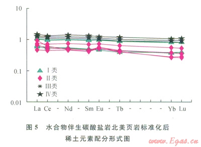 比值主要集中在1.04~1.30,反映了稀土元素中的輕稀土元素、重稀土元素的富集程度和分餾程度不強(qiáng)(表4)。4類(lèi)碳酸鹽巖樣品中雖然輕稀土、重稀土分異不強(qiáng),但呈現(xiàn)Eu異常;其中第Ⅰ類(lèi)和第Ⅱ類(lèi)碳酸鹽巖樣品中Eu表現(xiàn)一定程度的正異常特征(其平均Eu分別約為0.66和0.70),而第Ⅲ、Ⅳ類(lèi)碳酸鹽巖樣品中Eu表現(xiàn)為負(fù)異常(其平均Eu分別約為l.18和1.38);第Ⅱ類(lèi)碳酸鹽巖樣品中重稀土(åHREE)平均含量最低(約為21.67mg/g),而第Ⅰ、Ⅲ、Ⅳ類(lèi)碳酸鹽巖樣品中重稀土(åHREE)平均值分別為30.45mg/g、42.65mg/g、48.90mg/g。