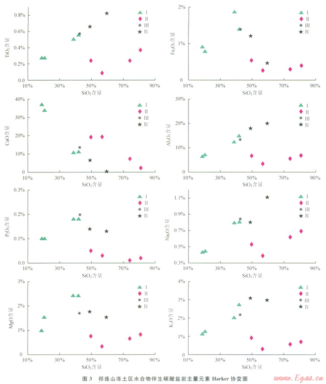 近幾年,在祁連山凍土區(qū)水合物科學(xué)試驗(yàn)鉆探過(guò)程中,觀察到大量與水合物伴生的碳酸鹽礦物,這些伴生碳酸鹽礦物(或部分)是否與水合物存在著某種成因上的聯(lián)系,還不得而知。由于碳酸鹽礦物?;煊兴樾汲练e且難以與碎屑沉積分選開(kāi)來(lái),筆者以祁連山凍土區(qū)新近發(fā)現(xiàn)的與水合物伴生碳酸鹽礦物及其混雜的碎屑沉積(統(tǒng)稱(chēng)碳酸鹽巖)為研究對(duì)象,從分析伴生碳酸鹽礦物所在沉積巖中主量元素、微量元素、稀土元素等特征入手,探討伴生碳酸鹽礦物可能物質(zhì)來(lái)源與沉積條件,試圖揭示不同產(chǎn)狀伴生碳酸鹽巖同水合物的內(nèi)在成因聯(lián)系。