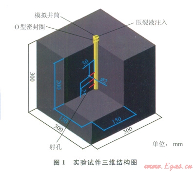 大型真三軸水力壓裂物理模擬實驗所用的人造試三維結(jié)構(gòu)及具體尺寸如圖l、2所示,具體試件制備程詳見本文參考文獻[2],筆者不再詳述。結(jié)合實際況及相似準則[14],設(shè)定實驗參數(shù):sv=15MPa,水平應(yīng)力差(sH-sh)分別為3MPa、6MPa、9MPa,180°相位角平面簡單布3排孔共6個。定義定向射孔方位角(q)為定向射孔方向與最大水平主應(yīng)力方向之間的夾角,根據(jù)實驗要求,q分別取值0°、30°、45°和60°。