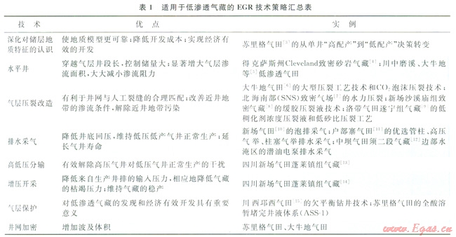 針對(duì)低滲透氣藏的增產(chǎn)措施已貫穿于從地質(zhì)研究、鉆井、完井、氣藏工程等直到氣藏停產(chǎn)的整個(gè)過(guò)程,其主要作用是增大氣體在儲(chǔ)層段的滲透能力,以增加單井產(chǎn)量、最終采收率,最終提高經(jīng)濟(jì)效益。低滲透氣藏的EGR技術(shù)策略總結(jié)如表l所示。