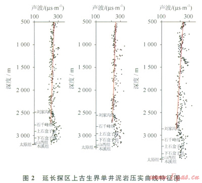 該區(qū)上古生界發(fā)育2套區(qū)域性蓋層:①下二疊統(tǒng)太原組海相石灰?guī)r,厚度介于15~45m,分布穩(wěn)定,也是本溪組的直接蓋層;②上石盒子組與石干峰組發(fā)育的泥質(zhì)巖系,厚度介于l50~350m,分布穩(wěn)定,橫向連續(xù),是山西組~下石盒子組氣藏的重要蓋層。對(duì)該區(qū)上古生界泥巖的壓實(shí)研究表明,聲波時(shí)差明顯高于正常壓實(shí)趨勢(shì)(圖2),表明上古生界普遍存在古超壓現(xiàn)象[11-13],其過剩壓力介于5~20MPa,最大過剩壓力出現(xiàn)在上石盒子組—石千峰組,組成上古生界壓力封存箱的箱頂,天然氣很難突破箱頂超壓體而在箱內(nèi)成藏[14-15]。前人的研究也表明[16-19],鄂爾多斯盆地上古生界匕石盒子組與石干峰組泥巖封蓋性能優(yōu)越,具有物性封閉和壓力封閉雙重封閉特征。