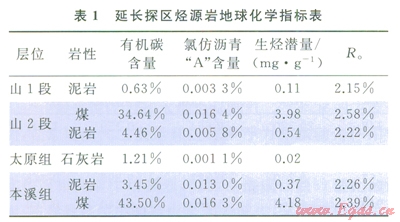 延長探區(qū)上古生界烴源巖為海陸交互相暗色泥巖、煤層及生物屑灰?guī)r,層位主要分布于下二疊統(tǒng)山西組、中石炭統(tǒng)本溪組和上石炭統(tǒng)太原組,平面分布穩(wěn)定,其中山西組泥巖厚度介于70~80m,煤層厚度介于l~7m,主要分布于山2段;太原組石灰?guī)r厚度介于10~40m,本溪組泥巖厚度介于l5~35m,煤層厚度介于1~6m。從地球化學(xué)指標(biāo)來看(表1),山l段泥巖生烴條件較差,平均有機(jī)碳含量?jī)H為0.63%,山2段和本溪組較好,其泥巖有機(jī)碳含量大于3%,煤層有機(jī)碳含量大于30%;太原組石灰?guī)r有機(jī)碳含量為1.21%,氯仿瀝青“A”含量和生烴潛量指標(biāo)均較低。上述情況表明:該區(qū)主力烴源巖為山2段和本溪組暗色泥巖及含煤層系。該區(qū)上占生界烴源巖鏡質(zhì)體反射率(R。)為1.59%~2.65%,普遍超過2%,處于過成熟干氣階段,生烴強(qiáng)度在28×108~40×108m3/km2。生烴量大,氣源充足,具有“廣覆式”生烴特征[3-9]。